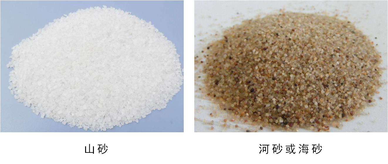 河砂或海砂由挖掘而來的海岸砂質或從河流漫灘沉積砂,其顆粒圓滑,來源廣,但常混有貝類碎片,海砂還含較多鹽分。