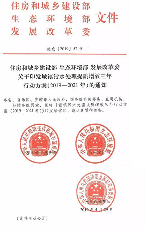 為貫徹落實全國生態環境保護大會、中央經濟工作會議精神和《政府工作報告》部署要求,加快補齊城鎮污水收集和處理設施短板,盡快實現污水管網全覆蓋、全收集、全處理,經國務院同意,住房和城鄉建設部、生態環境部、發展改革委印發《城鎮污水處理提質增效三年行動方案(2019-2021年)》(建城〔2019〕52號,2019年4月29日)。