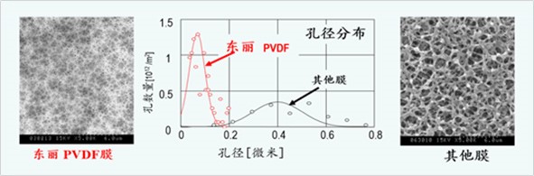 東麗的PVDF膜表面上孔的直徑小而均勻,相對于其他廠商的膜而言,東麗的PVDF膜不僅可生產高質量的產水,還具有卓越的透水性能,并且可以防止膜孔的污堵。